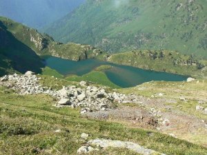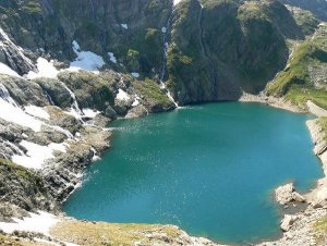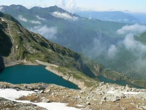 Para bajar, decidimos ir todo rectos hasta el Lac Bleu (se baja desde el pico todo derecho, yéndonos un poco hacia la derecha, para evitar los cortados que bajan al lago). En el lago, cruzamos la presa y cogemos el camino que por el otro lado supera un espolón y enlazamos de nuevo con el camino de subida más abajo que el refugio.