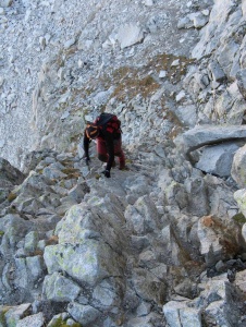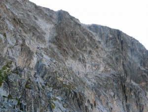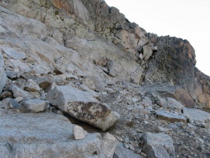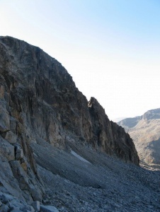 Inicio de la "cornisa" de la via normal, por esta canal.