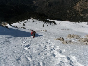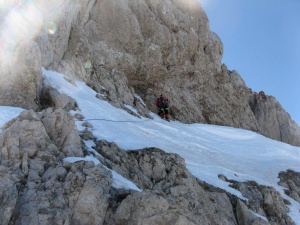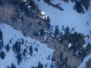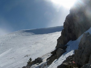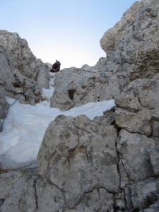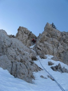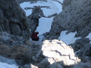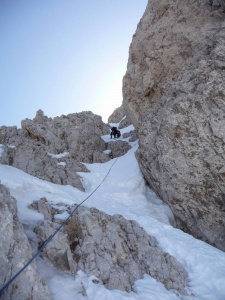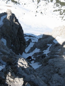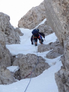Domingo 22, decidimos ir a la Rosa Paez 300m D. Nieve más o menos decente al empezar la aproximación, y cada vez peor hasta llegar a la entrada, donde realmente la nieve es mala. Subimos, pasamos un resalte con hielo yluego hay que hacer un pequeño flanqueo para llegar a unas palas, nieve muy muy mala y suelta. Da mucho miedo. Pero en la pala aun es mucho peor, mas que escalar te metes hacia dentro y la inclinacion ya es respetable. Llegamos hasta un muro rocoso donde dedidimos abandonar, justo antes dle largo flanqueo. Tres rapeles, mas destrepe, y abajo. Hay pocas fotos del domingo.
