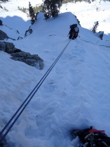 A mitad del corredor debido a la inestabilidad de la nieve, nos vemos obligados a abandonar. montamos un pitón para el primer rápel