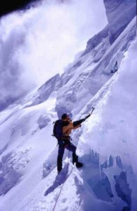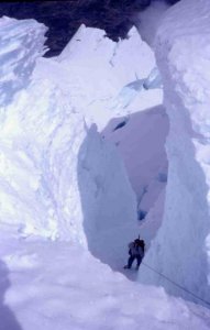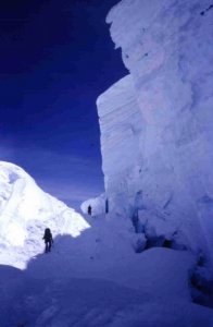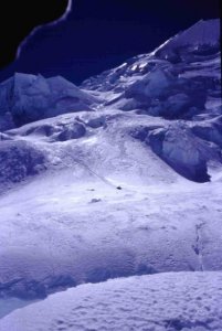 Subiendo entre seracs por la Canaleta entre el campo 1 y el campo 2