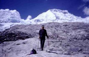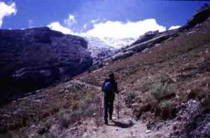 El autor camino del Campo Morrena con los dos Huascaranes de telón de fondo